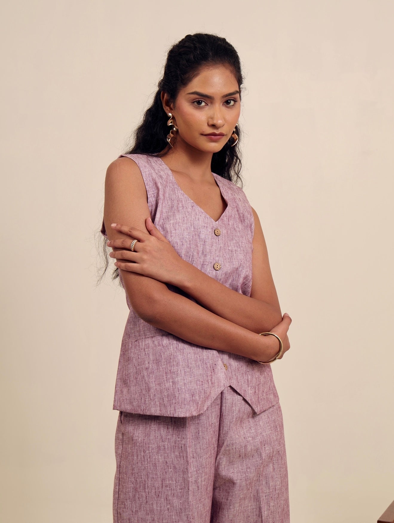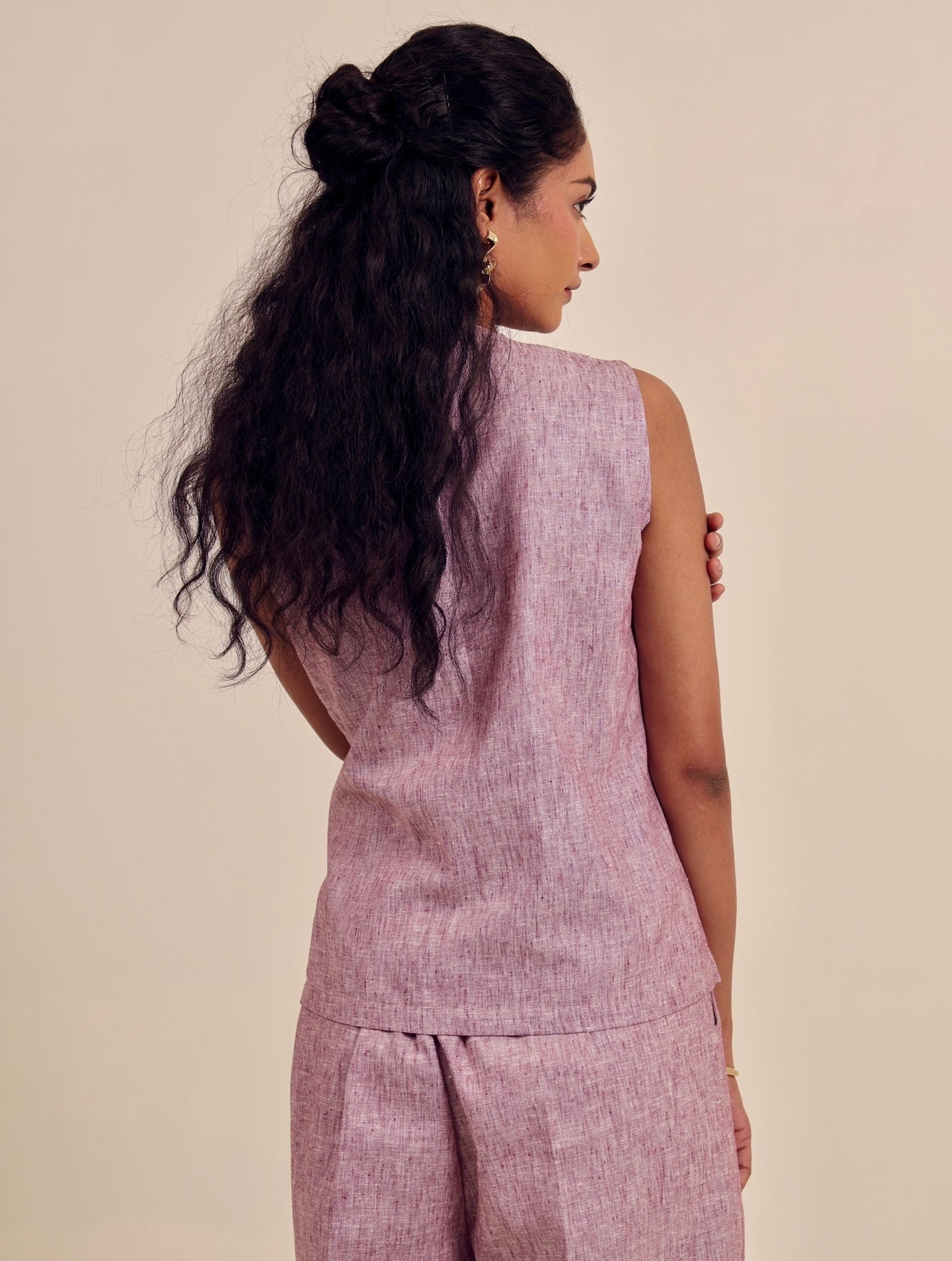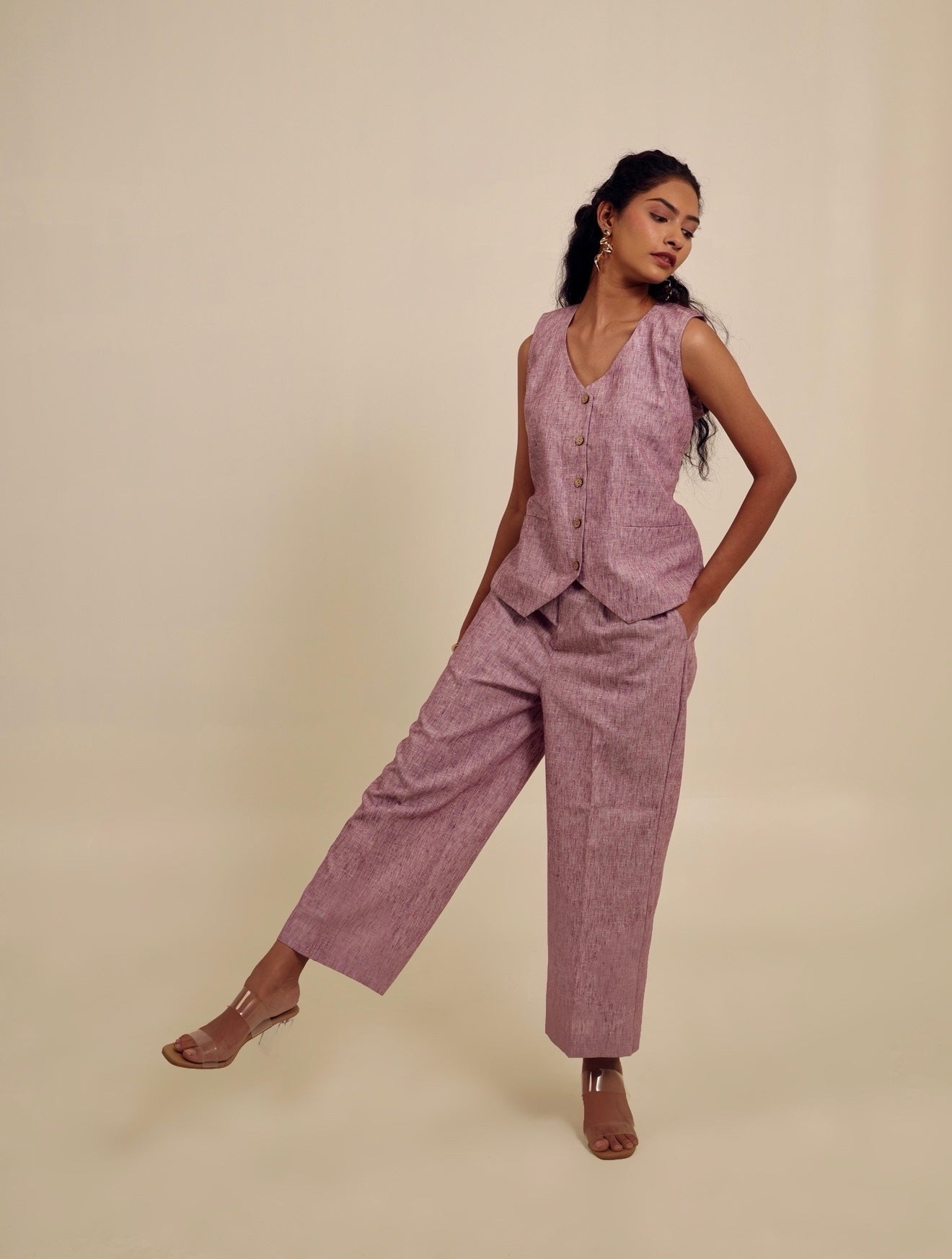 Tailored in a soft, heathered lilac linen-blend, the Rosé & Rule Set offers a refreshing take on structured dressing. The sleeveless waistcoat features a clean, minimal design with sharp tailoring and a deep V-neckline, while the matching high-rise trousers bring balance with a straight, easy fit. Lightweight yet polished, this set blends softness and strength—perfect for the modern woman who values both comfort and command.