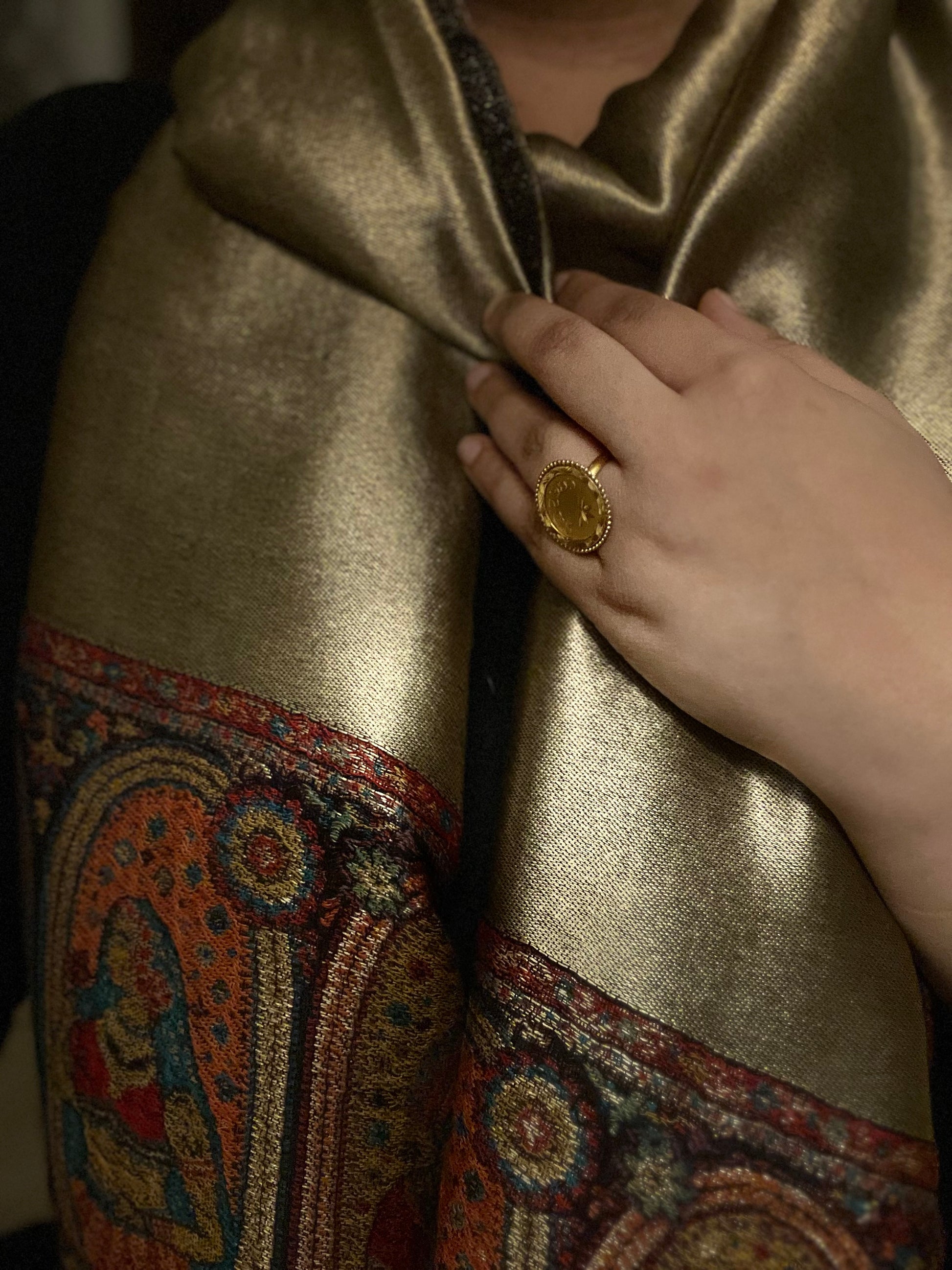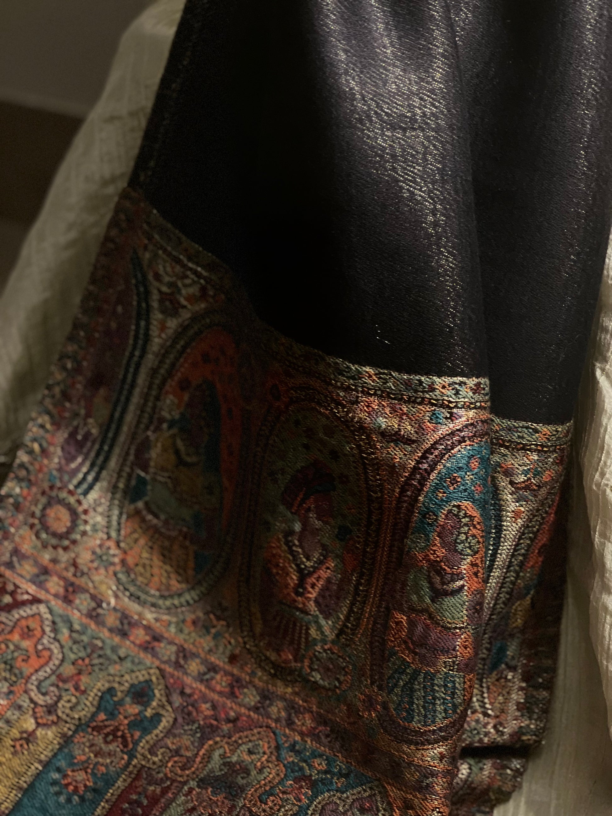 Aurum Noire is a study in contrast and glow. Crafted in Moonlight Pure Pashmina, this reversible stole moves effortlessly between radiant gold and commanding black; two distinct moods in one fluid, weightless drape. Soft to the touch and naturally warm, it adds depth and polish to any ensemble.