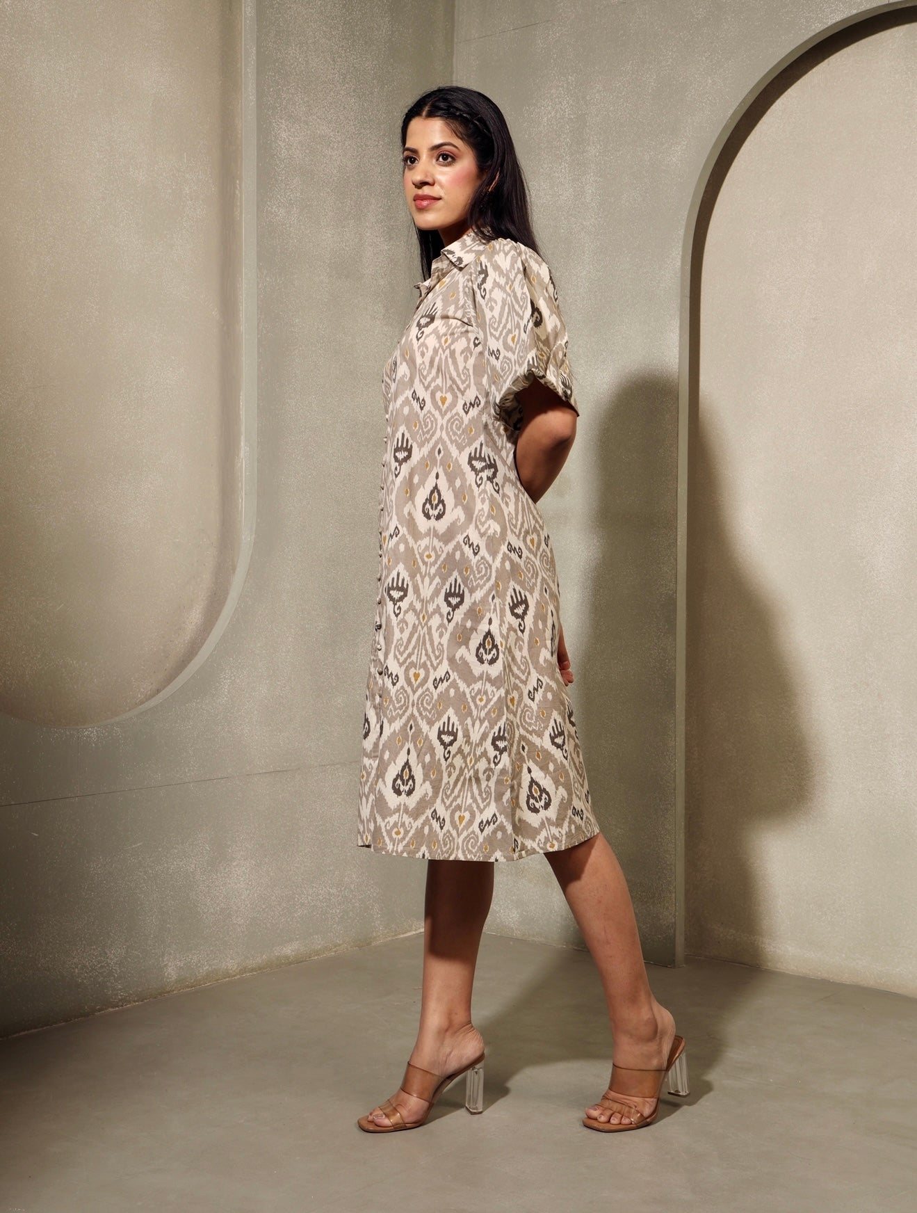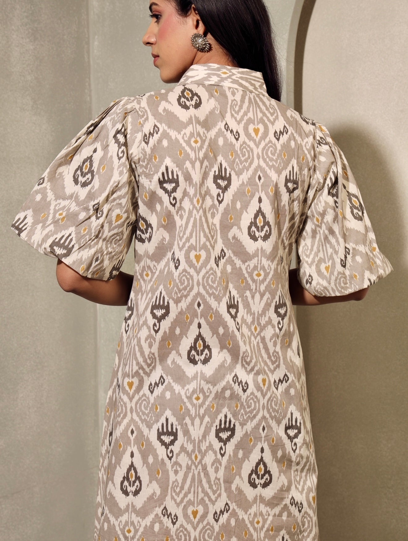 This isn’t your regular shirt dress—it’s your power move in Ikkat. With soft puff sleeves, delicate fabric buttons, and a neutral palette that makes chaos look calm, it’s a buttoned-up beauty that still knows how to play. Pair it with mules or jhumkas, depending on which mood you’re channeling today—desi drama or minimal muse.