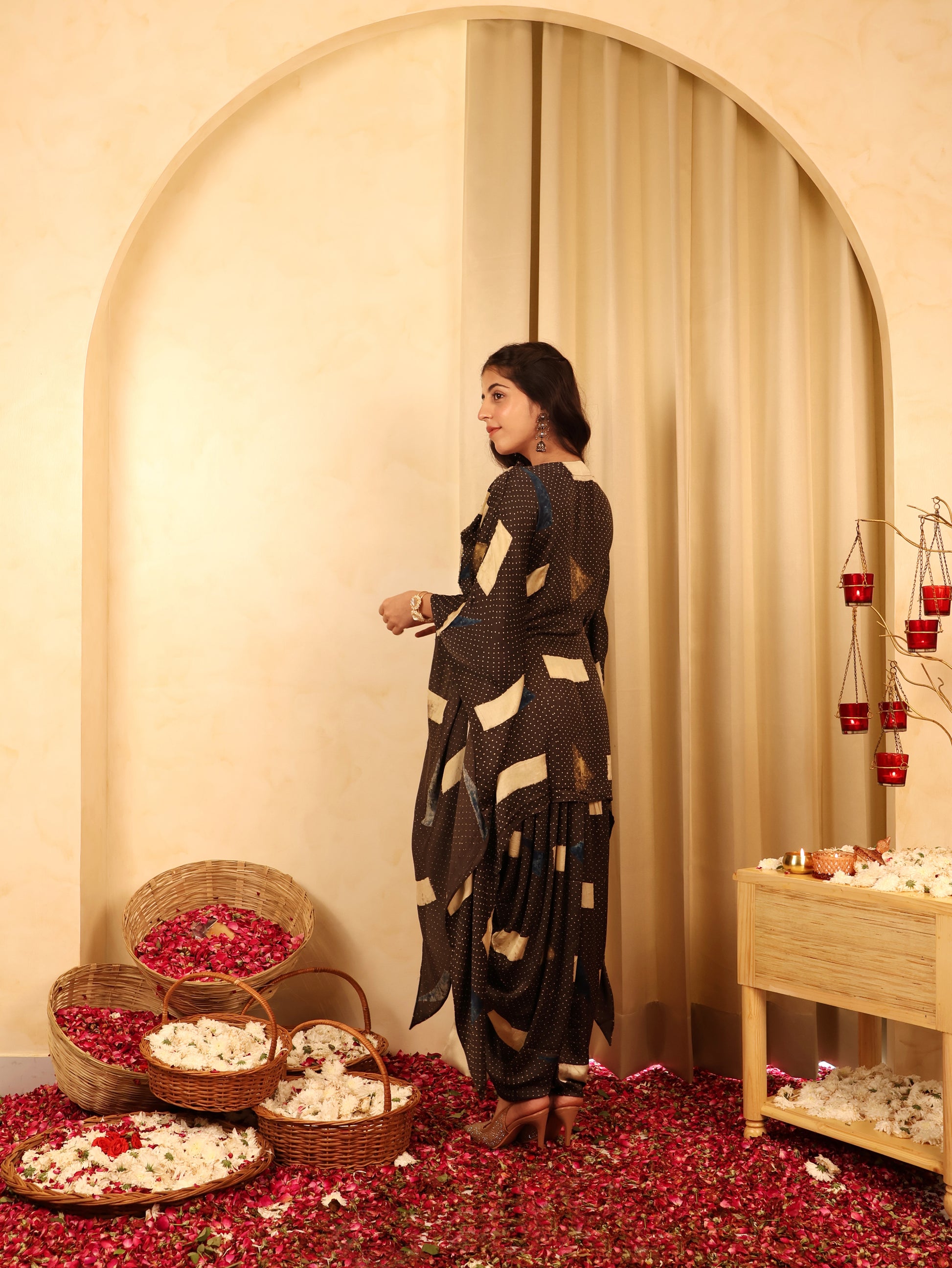 | A celebration of soft glamour, Calm Command brings festive ease to effortless luxury. Crafted in rich modal satin, the coord set features a kaftan-style upper paired with harem pants, blending fluid movement with regal charm. Intricate neck detailing adds a glimmer of festivity - refined, luminous, and never loud. The silhouette flows with quiet confidence, designed for evenings that sparkle softly and moments that linger long after. Fabric & Detail Highlights: - Two-piece coord set in modal satin - Kaftan-inspired upper and harem pants for fluid elegance - Embellished neckline for a festive yet understated glow - Light, breathable sheen with graceful fall |
