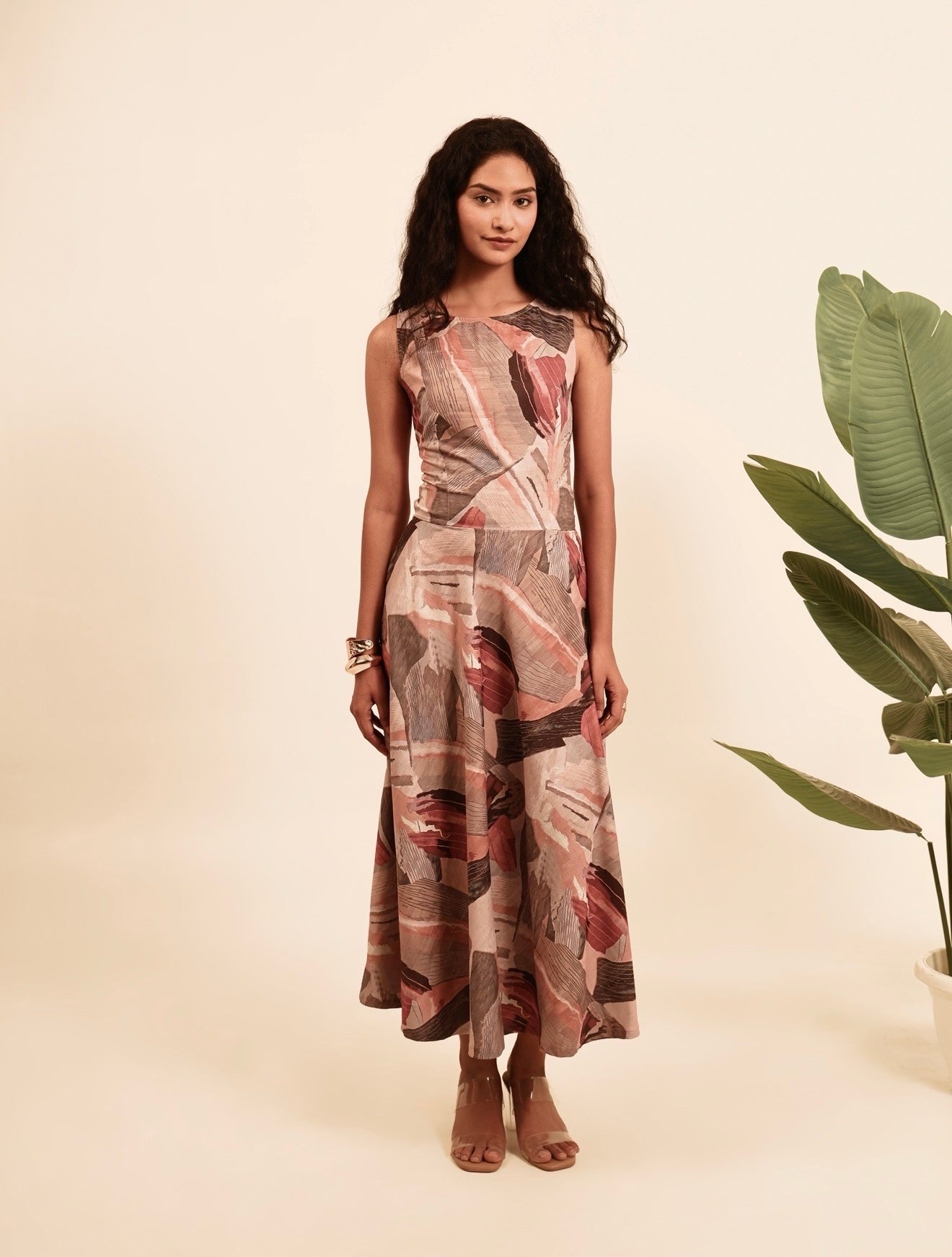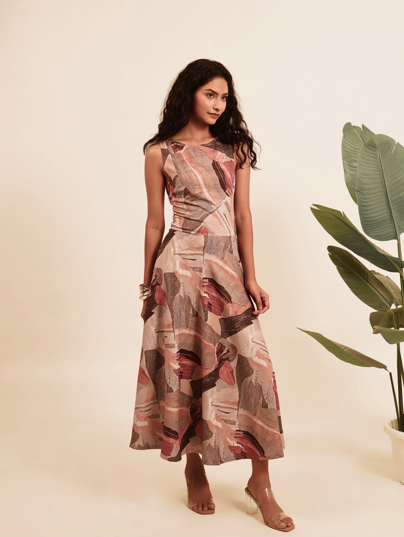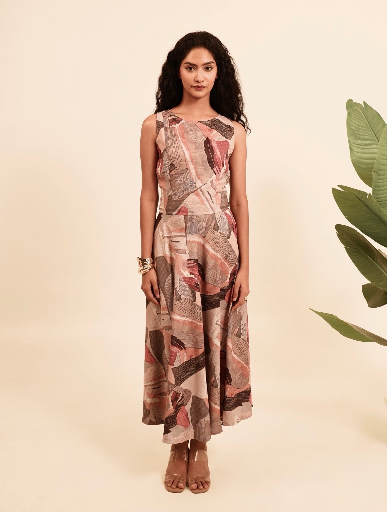 Effortlessly elegant and lightweight, the Chaar Charm Dress features an abstract print in soothing tones of blush, rust, and slate. Crafted from a breezy, summer-cool fabric, this sleeveless midi dress drapes beautifully and feels feather-light on the skin. A subtle cut-out at the lower back adds a playful twist, elevating its charm while keeping things cool and contemporary—perfect for warm days and easy transitions from day to evening.