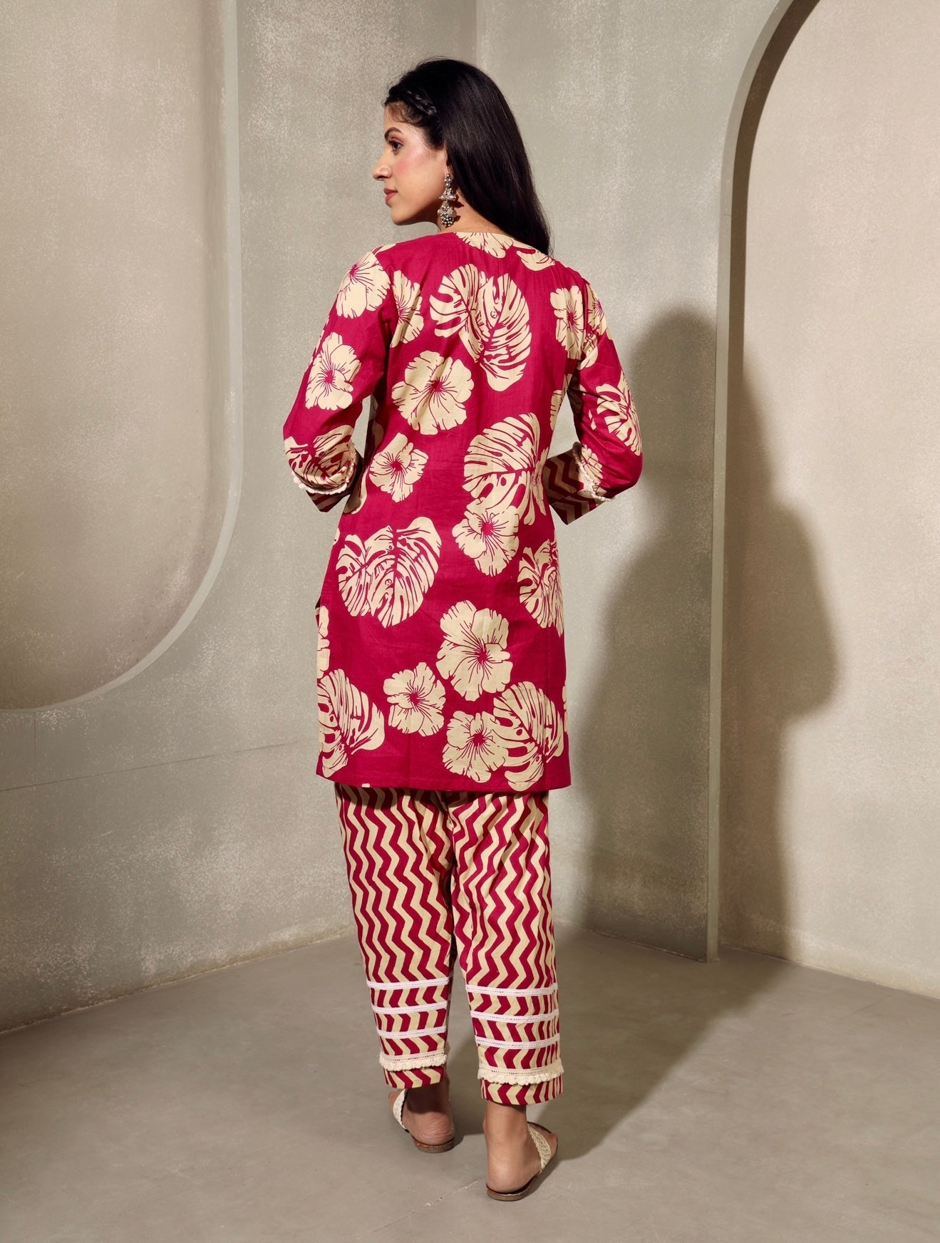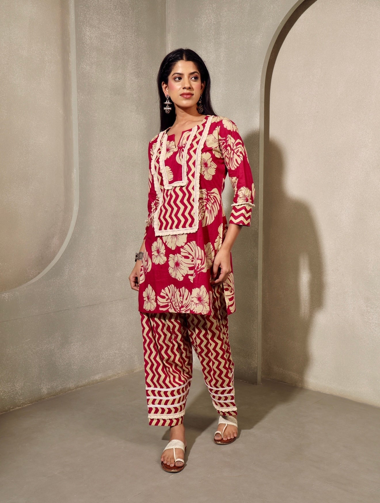 A celebration of contrast and craft. This two-piece set features a bold floral print kurta in striking rani pink shade, accented with zigzag panels and delicate lace trims that bring softness to its graphic edge. The silhouette is relaxed yet structured, paired with our signature Farsi Salwar—reimagined in matching chevron print and lace-detailed hems.