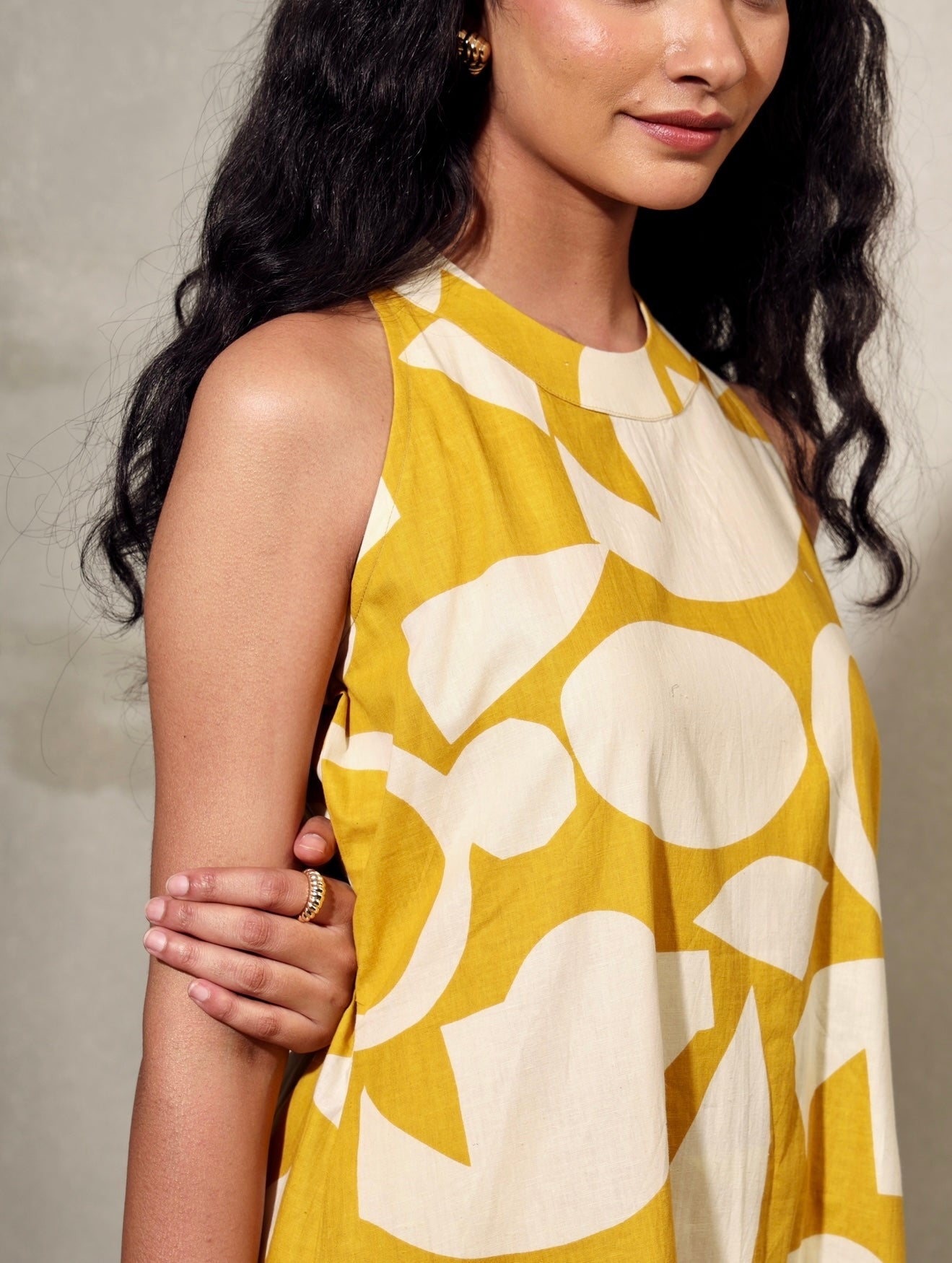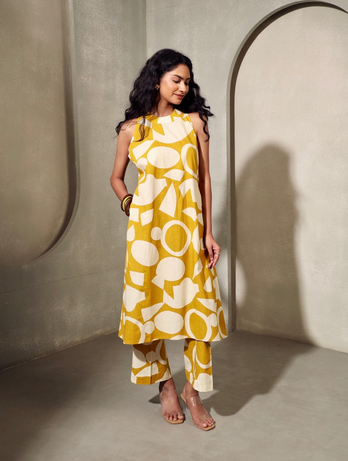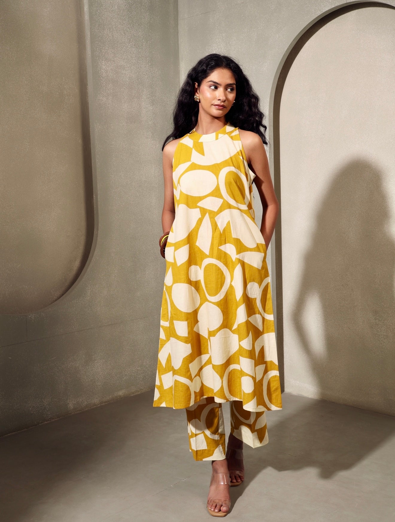 Artful, airy, and made to stand out. This two-piece set features a sleeveless, high-neck kurta in an A-line cut, paired with straight pants—both printed in a striking mustard and ivory abstract pattern. Made from breathable cotton, it’s designed for all-day ease with an edge.
