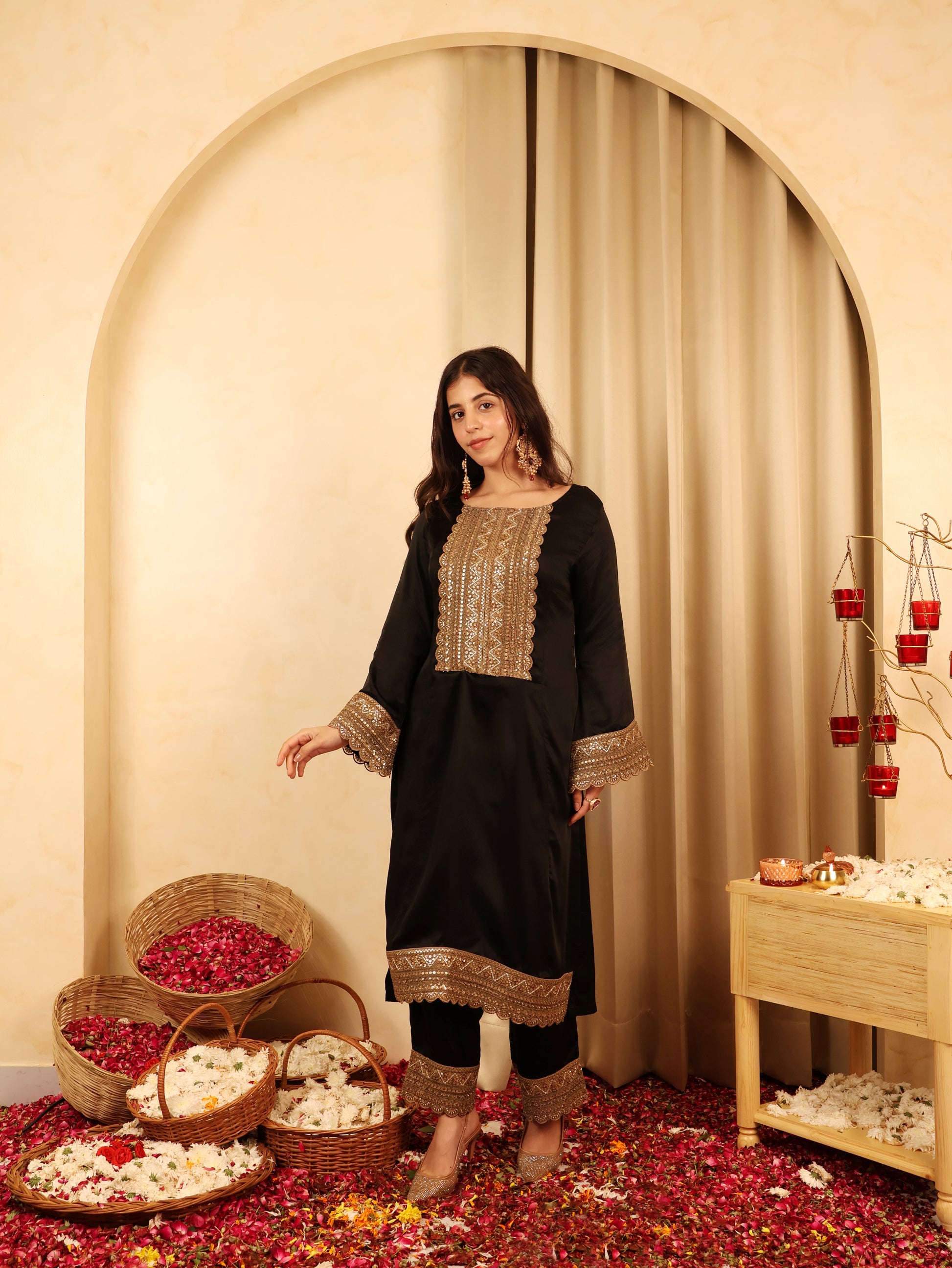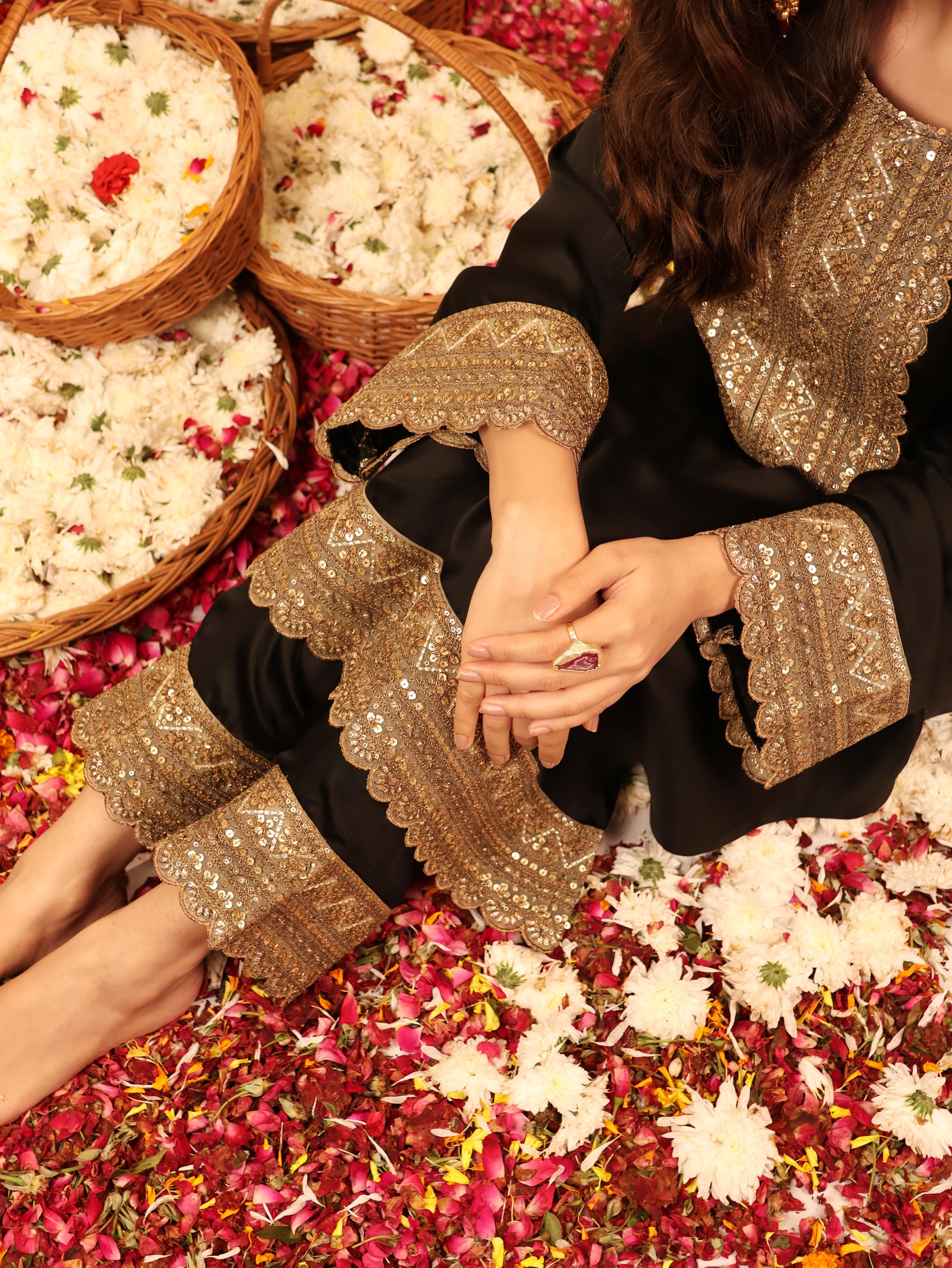 | Where elegance meets ease - Goldplay is a two-piece coord set crafted in buttery-soft modal fabric, designed to move with quiet confidence. The rich black canvas is elevated with hand-crafted lace detailing, adding a touch of festive gold that glimmers just enough. A study in balance - fluid yet structured, minimal yet indulgent - Goldplay captures the effortless glamour that defines modern celebrations. Perfect for evenings that call for understated luxury, it’s your invitation to shimmer without shouting. Fabric & Detail Highlights: - Crafted in 100% modal for a soft, fluid drape - Two-piece coord set - relaxed top with tapered bottoms - Accented with handmade gold laces - Lightweight, breathable, and festive-ready - Designed for modern ease and timeless charm |