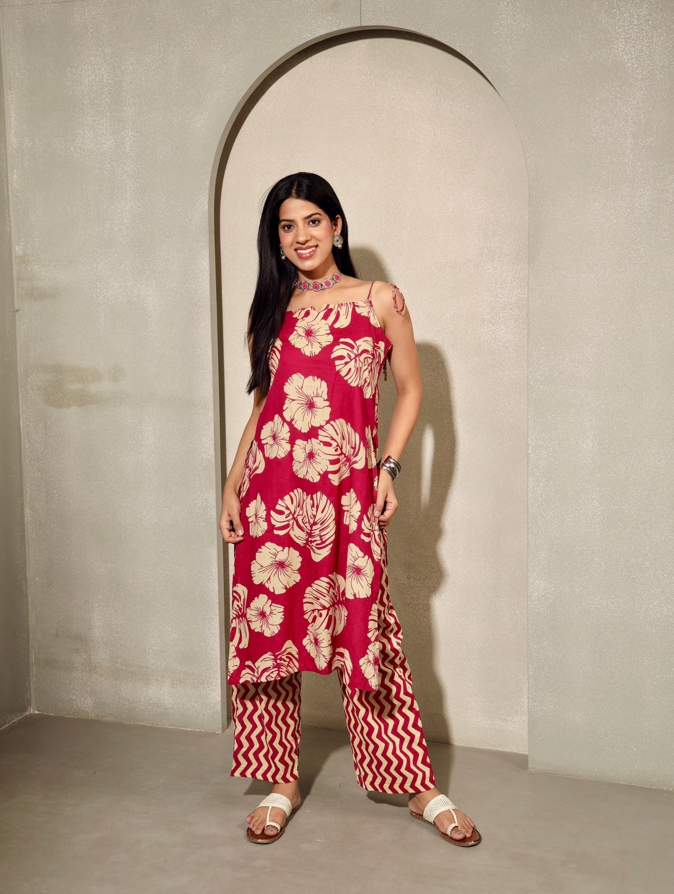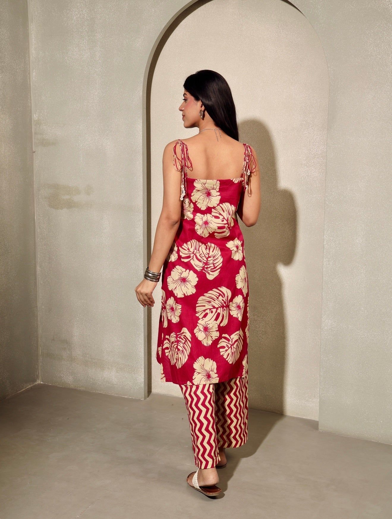 A playful nod to summer ease, this strappy kurta set is all about easy-breezy charm. Featuring delicate shoulder ties with button accents and bold tropical florals on a rani pink canvas, the top flows into an asymmetric hem for a relaxed silhouette. Paired with contrast chevron-print straight pants, this look walks the line between laid-back and statement-making. Made for balmy days and brighter moods.