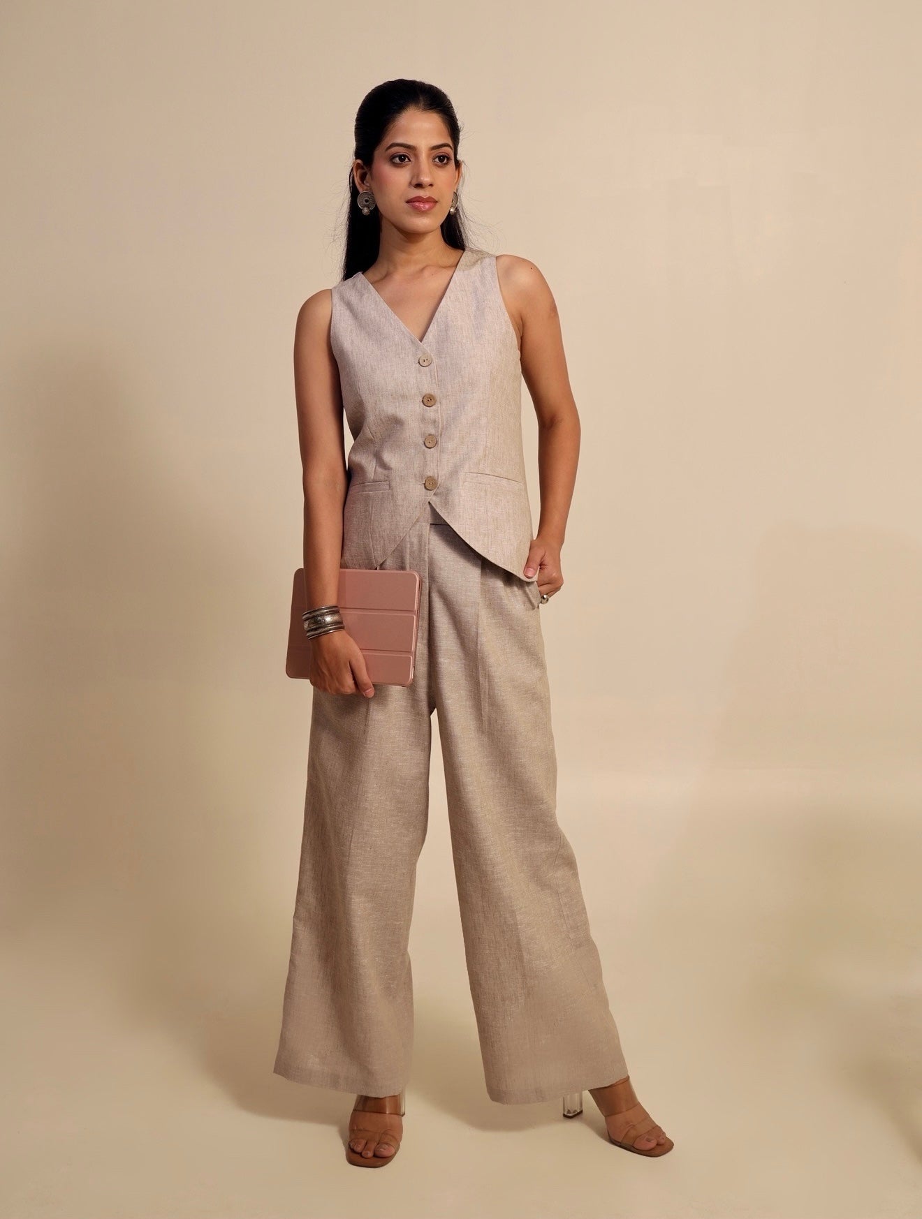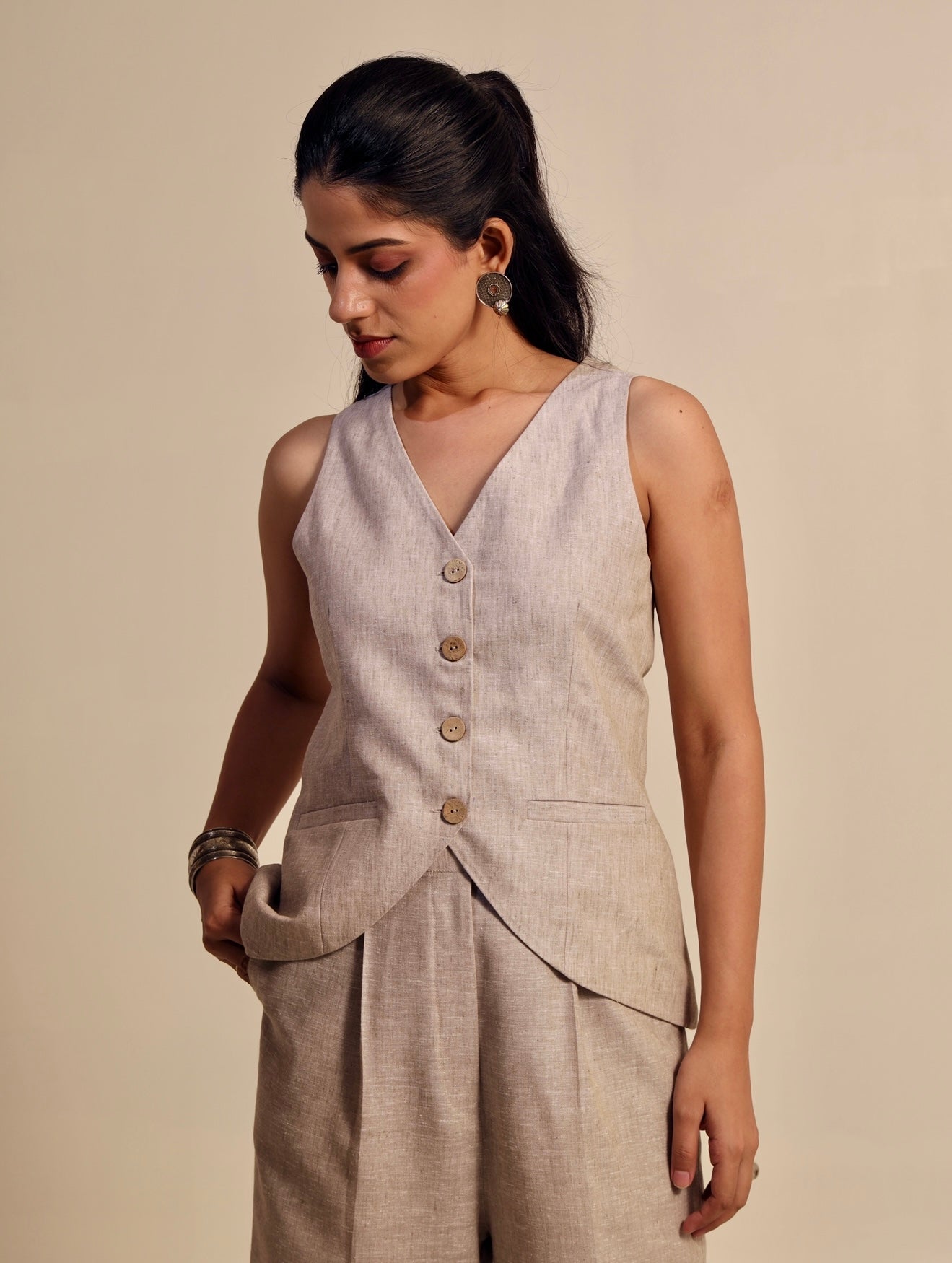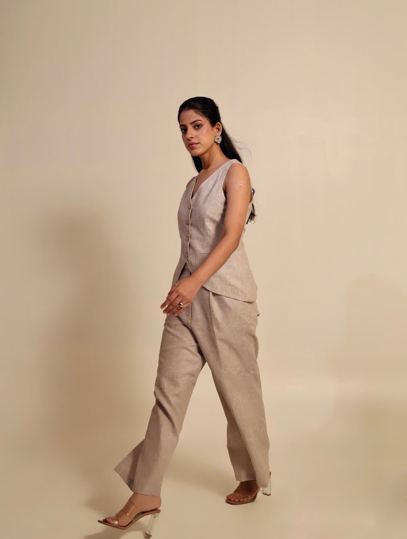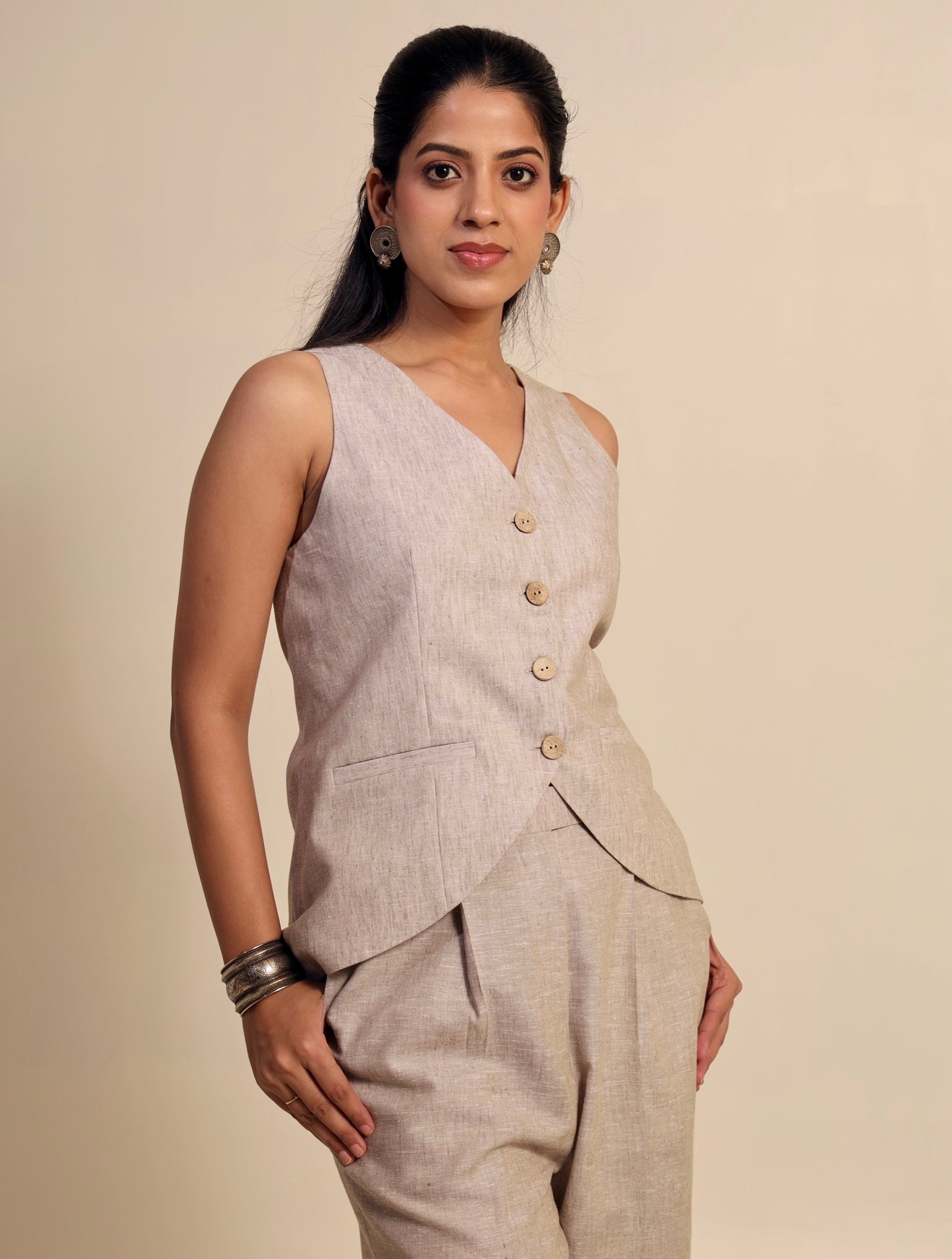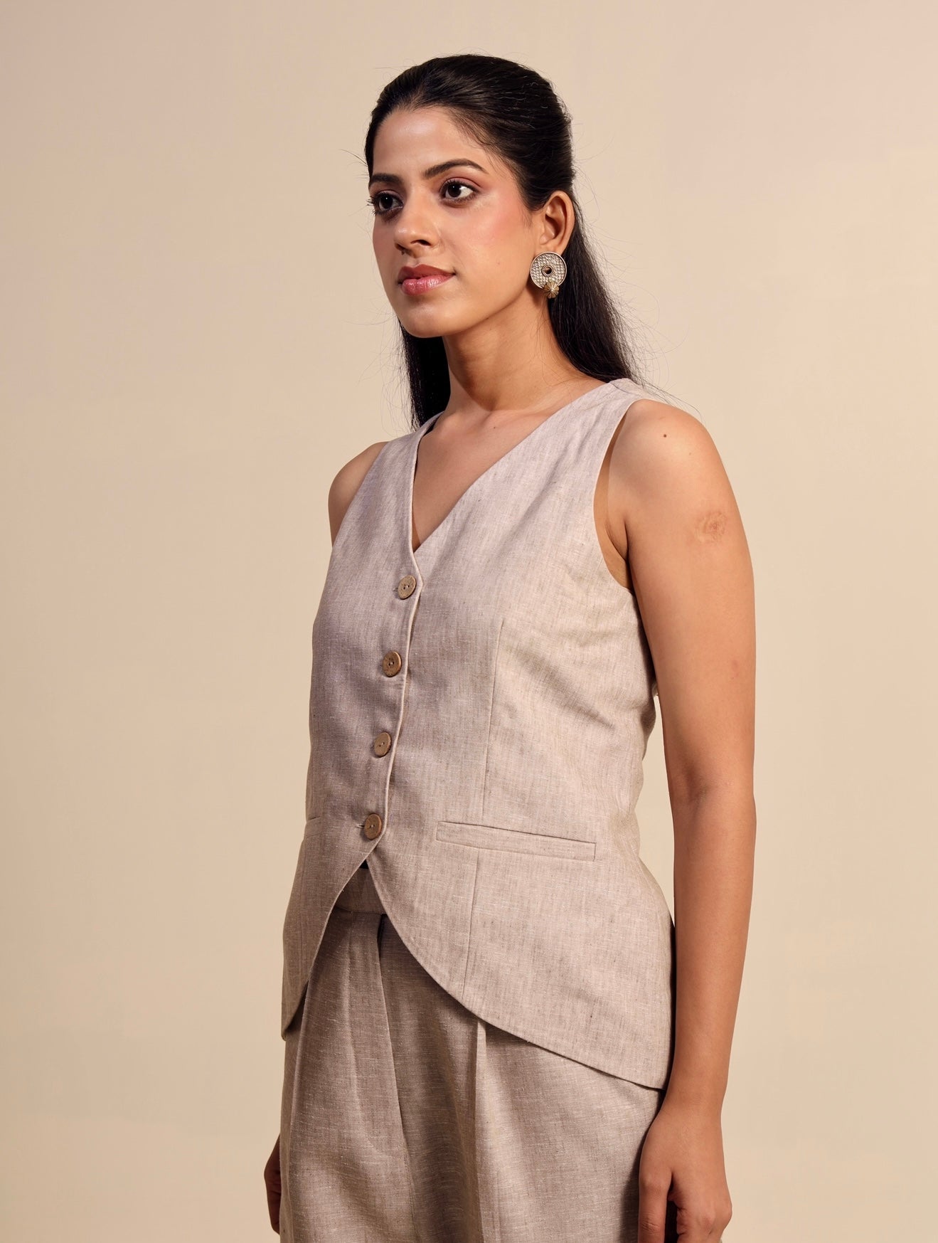 Tailored in a luxurious silhouette, this waistcoat set exudes effortless sophistication. The structured V-neck waistcoat features an elegant inverted V-cut that artfully accentuates the waist, while the straight-fit trousers create a clean, elongated silhouette. Polished, poised, and designed to leave a lasting impression.