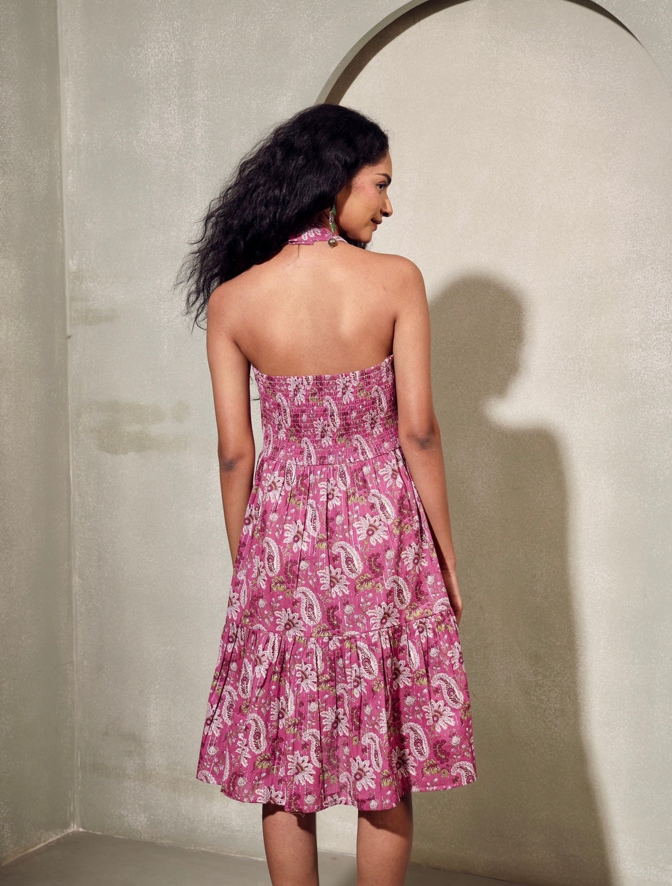 Designed to flatter, made to move. This halter-neck midi dress in soft cotton features a paisley and floral print in romantic rose tones. The smocked back contours comfortably, while the tiered skirt adds graceful volume and ease.