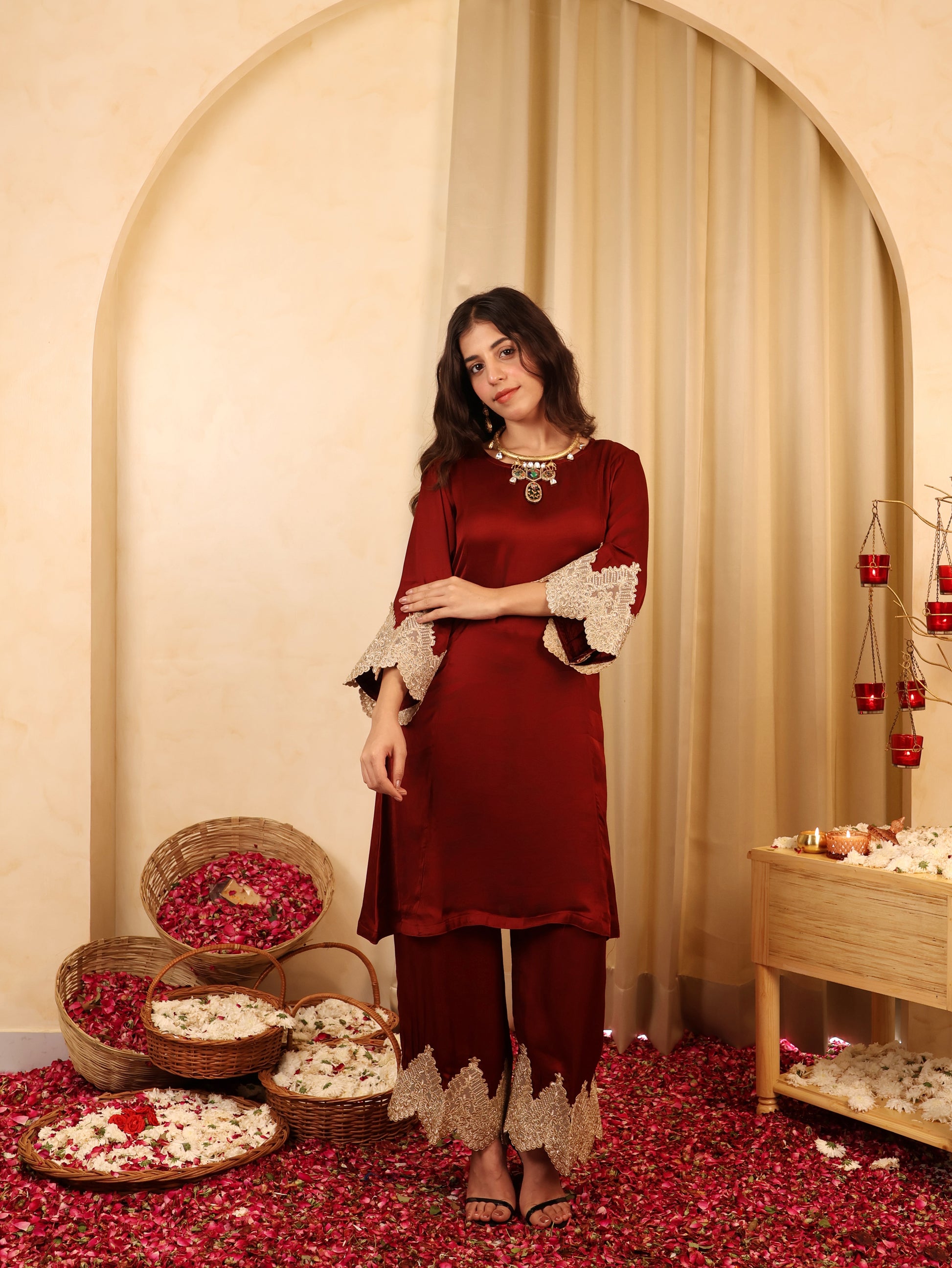 | Raise a toast to effortless celebration - Sangria Season is crafted in lustrous modal satin, bringing festive sheen and fluid grace in perfect harmony. The deep hue drapes beautifully, while embroidered lace accents add an opulent finish to its refined silhouette. Designed for soirées that linger and laughter that glows, this two-piece coord set captures the spirit of festivity without losing its calm. It’s elegance with ease - rich, radiant, and ready to celebrate. Fabric & Detail Highlights: - Two-piece coord set in modal satin - Embroidered lace detailing for a festive touch - Relaxed yet polished fit for all-day comfort - Ideal for celebrations that call for understated glamour |