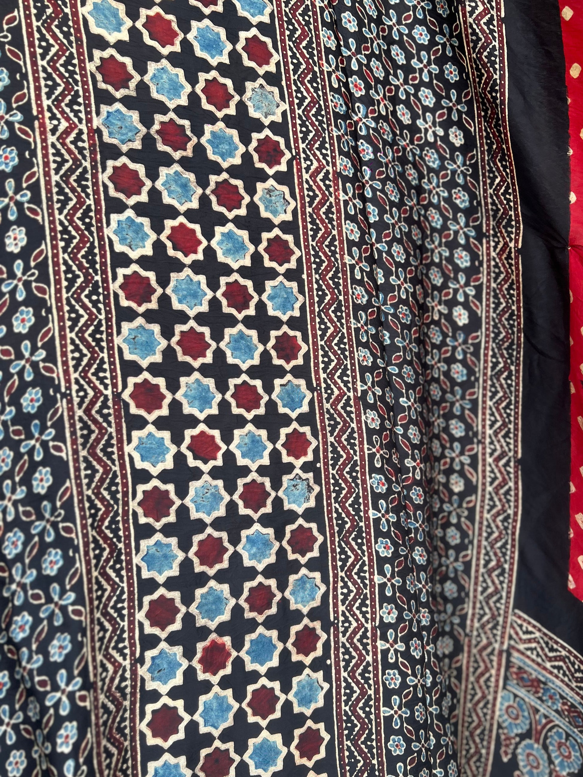 Anya is a handcrafted premium modal saree in Bandhani print across the body and a contrasting Ajrakh hand block printed pallu. The fluid modal base enhances everyday comfort while preserving the depth and precision of traditional techniques.